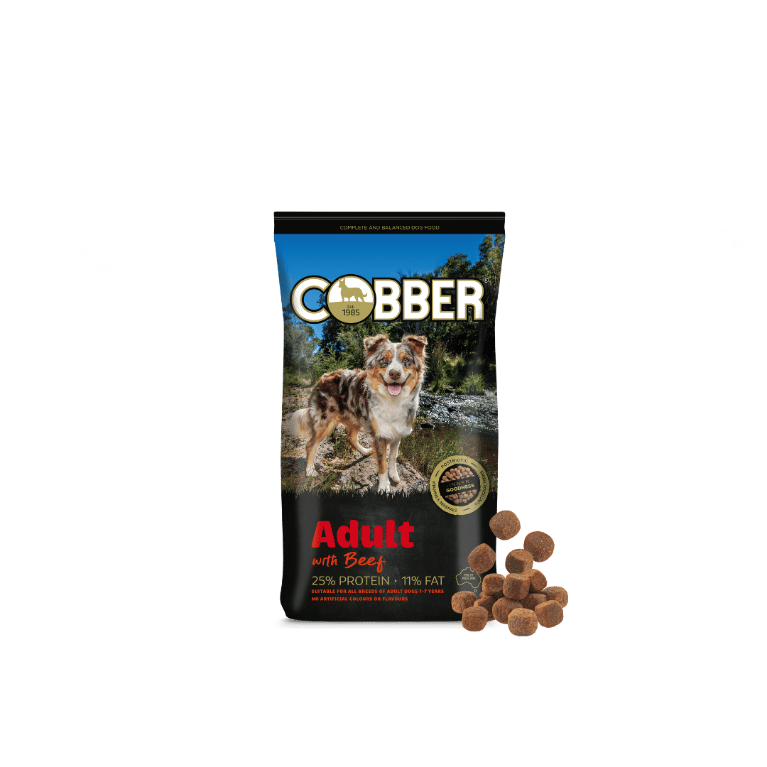 Cobber Adult with Beef is a quality Australian beef dog food suitable for all breeds of adult dogs between 1-7 years. Built with Cobber’s Inner Goodness, a unique combination of vitamins and minerals, postbiotic and functional fibres, this beef flavoured adult dog kibble keeps your dog happy on the outside and healthy on the inside.