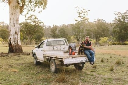 When not working sheep or cattle, now that caring for the next generation of Kelpies is a thing of the past, Flow has plenty of time for curling up comfortably in a hole she’s dug under Brad’s chair while he sits on a riverbank fishing.